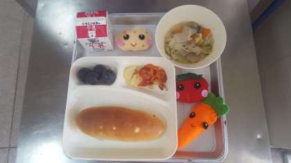 今日の献立は、鶏肉とてぼ豆のスープ煮・じゃがいもとトマトのチーズ焼き・ぶどう(巨砲)・おさつパン・牛乳です。