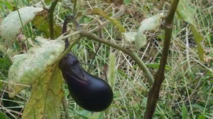 なすびが1つ実っていました。玄関の花も夏の名残を惜しむように咲いています。