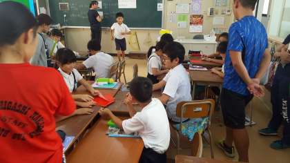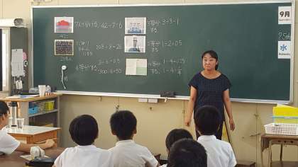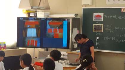 赤玉やペットボトル、折り紙などを用いて単元の目標に近づいていく楽しい授業でした。子ども達の考えたことをタブレット端末に撮り、それを大型モニターに映すなどICTを活用した授業でした。