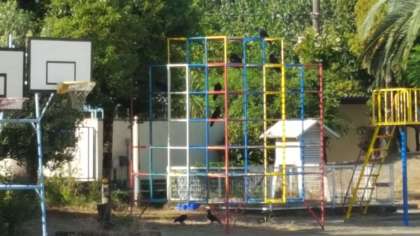 運動場にはいろいろな鳥がやってきます。ハトやカラスです。ここ最近はカラスが、集団でやってきて困りものです。今朝は、ジャングルジムにたくさんとまっていました。