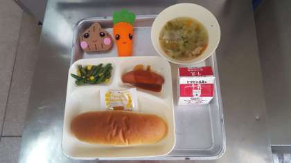 今日の献立は、フランクフルトのケチャップソース・スープ・三度豆とコーンのサラダ・コッペパン・マーマレード・牛乳です。