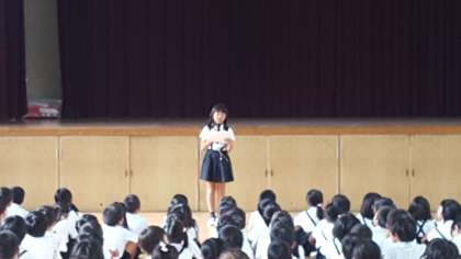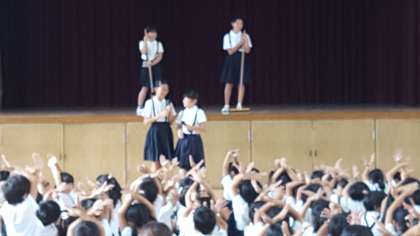 今日の児童集会は、環境委員会の発表でした。正しい掃除のしかたをクイズ形式で発表しました。子ども達は、大きな×を作ってクイズに答えていました。