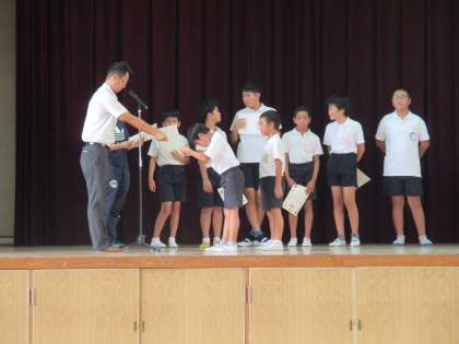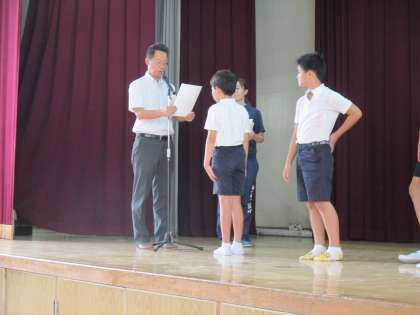 全校朝会の後に、後期の学級代表の認証式が行われました。校長先生から1人ずつに認証書が手渡されました。その後に、各自が決意発表をしました。学校をよくしていくためにしっかりがんばってください。