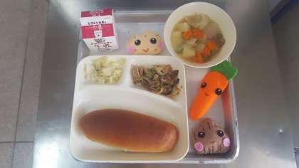 今日のメニューは、豚肉のカレー風味焼き・スープ煮・サワーキャベツ・黒糖パン・牛乳です。