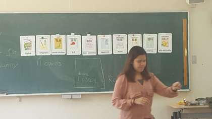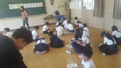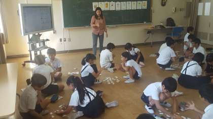 5年生は、教科の名前を学習しました。教科のカードを裏返し、2人組でめくりながら発音をし、カードを合わせていました。全教科の名前は覚えましたか?