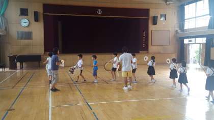 講堂では、披露する場所を確認しながら、大きな振りをつけての練習でした。