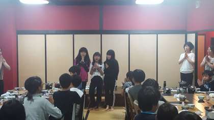 食事の様子です。5ごちそう様をした後、まとまった雨雲が近づいているので散策をやめて室内ゲームにする連絡がありました。
