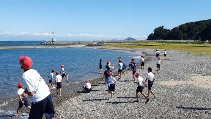 波打ち際を歩く子、石を投げる子もいます。が、海に向かって叫ぶ子はいませんでした。菅島で、たくさんの思い出ができました。