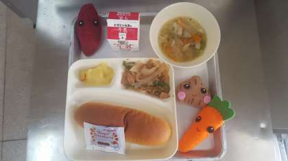 今日の献立は、豚肉と野菜のケチャップソテー・スープ・スイートポテト・コッペパン・いちごジャム・牛乳です。