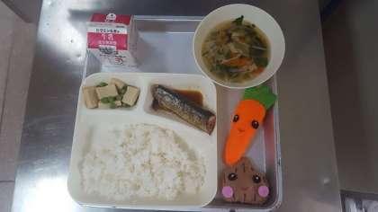 今日の献立は、さんまの山椒焼き・すまし汁・高野豆腐の煮物・ごはん・牛乳です。