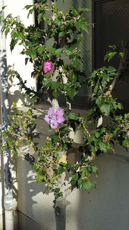 きれいな紫の花が2輪咲いていました。一輪車もきちんと整理されています。気持ちがいいです。