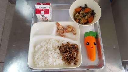 今日の献立は、鶏肉の竜田揚げ・おかか菜っ葉・厚揚げと野菜の煮物・ごはん・牛乳です。
