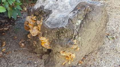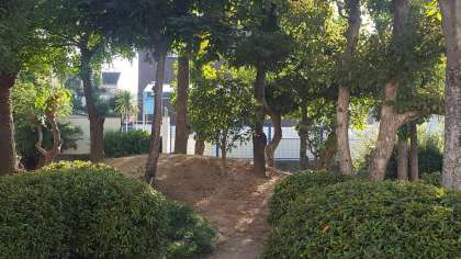 侘びを感じるきれいに整えられた築山です。光と影のコントラストが美しいです。校内には、あちこちでキノコがはえています。絶対に触らないようにしましょう。