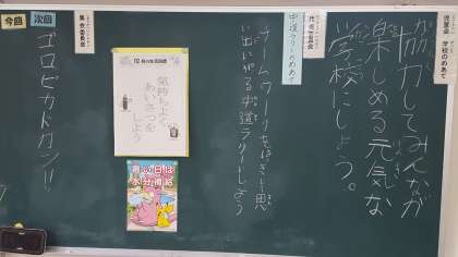 竹馬もきちんと整理されています。気持ちがいいですね。児童会の黒板です。職員室前にあります。
