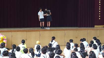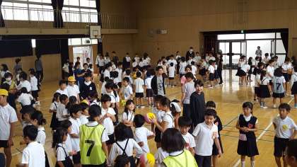 集会委員が、「ドン」といったときにボールを持っていた子は、早口言葉を言うというルールでした。「カエルぴょこぴょこ・・・」とか「なまむぎなまごめ・・・」とか、「とうきょうとっきょ・・・」と早口言葉を言っていました。