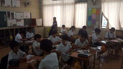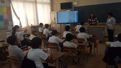 同じく今日は、I have a(an) 〜 でした。施設のカードを裏返しに置き、ペアとカードの取り合いをしました。発音をしながら、同じ施設のカードのペアを作っていました。この遊びは休み時間にもできますね。
