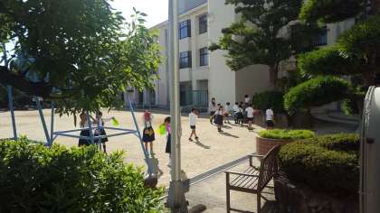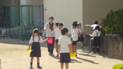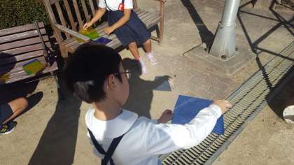 2年生が図画工作で使うセロファン紙を、陽光に当てて映った色を楽しんでいました。単色で見てみたり、複数枚を重ねて色の違いを確かめていました。