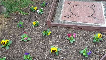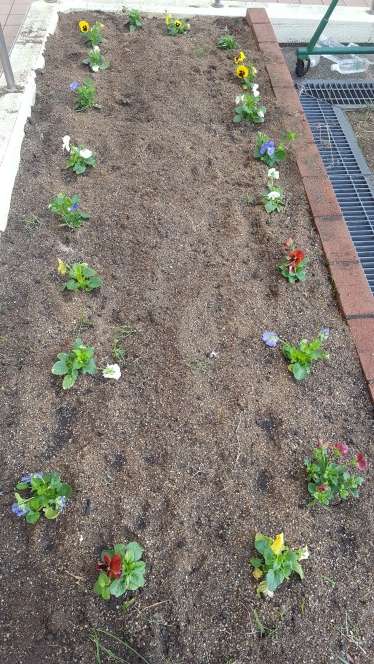 春の花、パンジーが玄関と花壇に植えられました。満開になるころには新しい学年を迎えます。