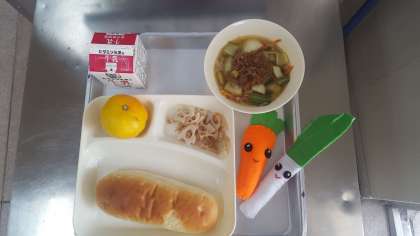 今日のメニューは、担担麺・蓮根のオイスターソース焼き・みかん・おさつパン・牛乳です。