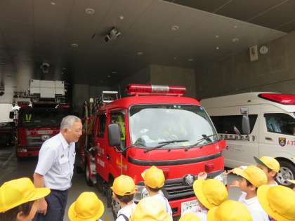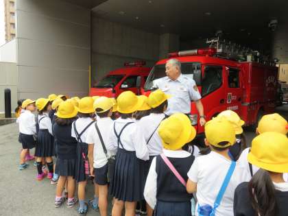 2年生が社会見学で、東成消防署に行きました。署員の方から説明を聞きながら、所内や緊急車両を見学しました。