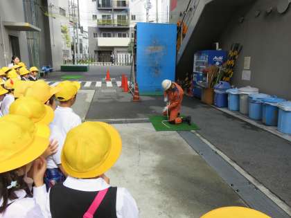 実際にホースを持ちました。みんなは、その重さに驚いていました。最後に隊員の方の訓練の様子を見せていただきました。