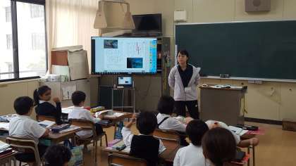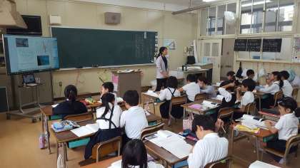 1組は、国語で、「ビーバーの大工事」を学習しました。ダムをつくる様子を、デジタル教科書に書き込みをしながら探っていました。