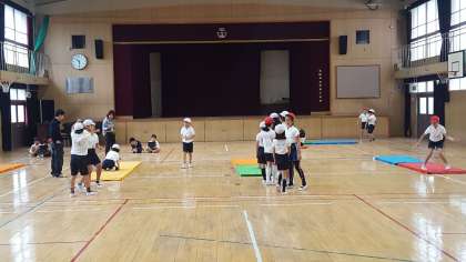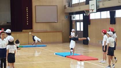 4年1組は、講堂で体育の授業でした。マット運動をしていました。それぞれの技に挑戦していました。目標を達成するために、がんばりましょう。