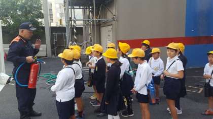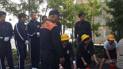 消火器と煙テントの体験をしました。消防署へ職場体験に来ていた中学生が、子ども達に説明をしてくれました。