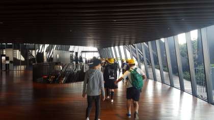 朝日新聞社に到着し、中に入るまでの様子です。なんと、朝日新聞社は、フェスティバルホールの上にありました。