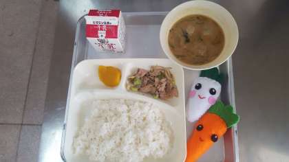 今日の献立は、豚肉とまいたけの炒め物・つみれ汁・かぼちゃういろう・ごはん・牛乳です。