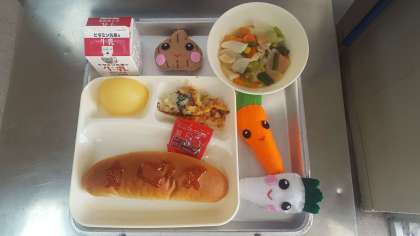 今日の献立は、ほうれん草のグラタン・スープ煮・白桃(缶)・コッペパン・イチゴジャム・牛乳です。