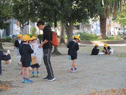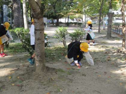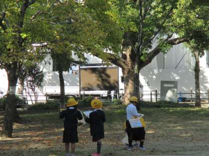 1年生が秋見つけの学習で、東小橋公園に行きました。ビニール袋を持って見つけた秋を入れていました。