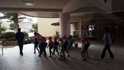 キッズファースト保育園の皆さんが学校見学で、中道小学校に来ました。運動場や校舎を回り、1年生の授業の様子を見学しました。