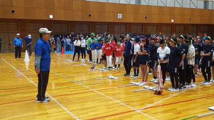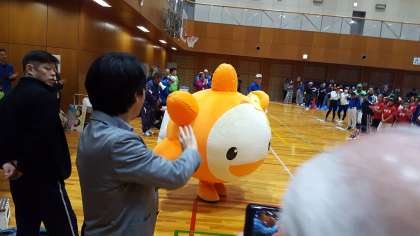 日曜日に、東成スポーツセンターで、区子ども会親善スポーツ大会が行われました。中道校区からは、50人を越える子どもたちが参加しました。開会式の様子です。キャラクターも参加しました。