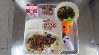 今日の献立は、ビビンバ・わかめスープ・アーモンドフィッシュ・牛乳です。