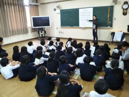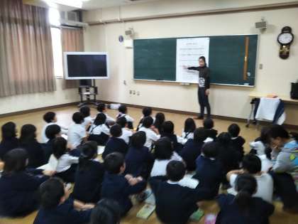 2年生が、民族講師の李 智恵ソンセンニㇺの授業を受けました。12月3日(火)の、民族クラブ校内発表会で踊る「オㇽチェンイワ ケグリ」(オタマジャクシとカエル)のダンスの学習をしました。楽しい曲にのって踊っていました。