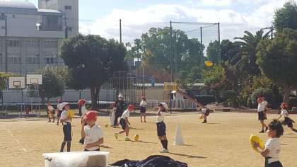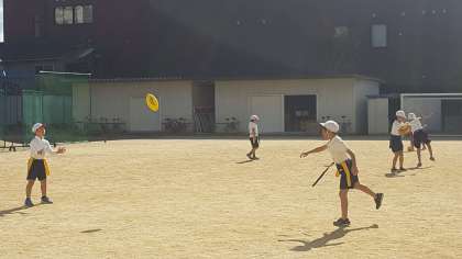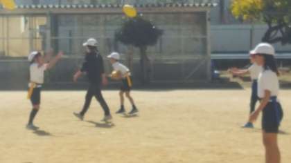 3年生は体育の授業で、タグラグビーをしていました。2人組でパスの練習をしていました。しっかり練習して、日本代表のような華麗なパス回しをしましょうね。しかし、オフロードパスはしてはいけません。危険です。