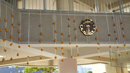 実は、管理作業員さんと玉津中学校からの職場体験に来ていた3人が、柿もぎをして、収穫してくれました。そして、皮をむいて、紐でくくって、干し柿にして、玄関ピロティにつるしています。もうしばらくしたら甘くなると思います。今から楽しみです。