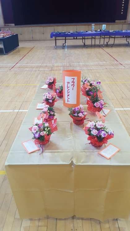 子どもたちが作ったフラワーアレンジメントです。講堂中央に展示しています。