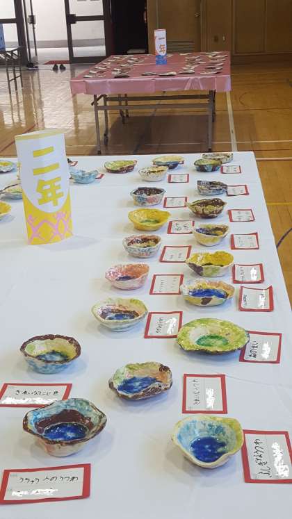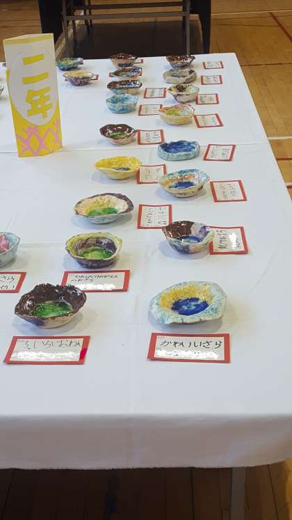2年生の作品です。作品はカラフルな器です。色遣いがいかにも子どもらしく、大人になったら作ることができない、今の時期にしか作れない器です。素晴らしいです。