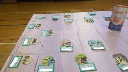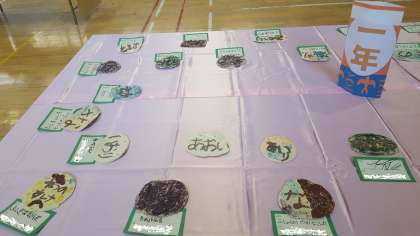 1年生の作品です、焼き物のネームプレートです。どれもこれも個性的で、まねができない作品です。1年生の記念に残るいい作品です。大人になって見たときに、当時を想い出せる作品なので、大切にとっておきましょう。