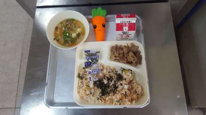 今日の献立は、鮭と小松菜のごはん・豚肉とれんこんの甘辛焼き・冬野菜の味噌汁・牛乳です。