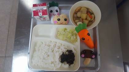 今日の献立は、関東煮・あっさりキャベツ・のりのつくだ煮・ごはん・牛乳です。