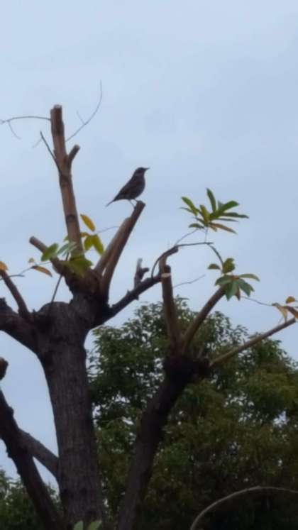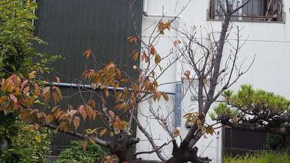 桜の葉が美しく色づく前に散り始めました。木の枝に鳥が1羽止まっていました。絵になる1枚です。