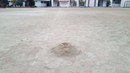 運動場に砂山ができていました。遊んだ後は、元に戻しておきましょう。