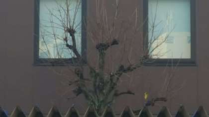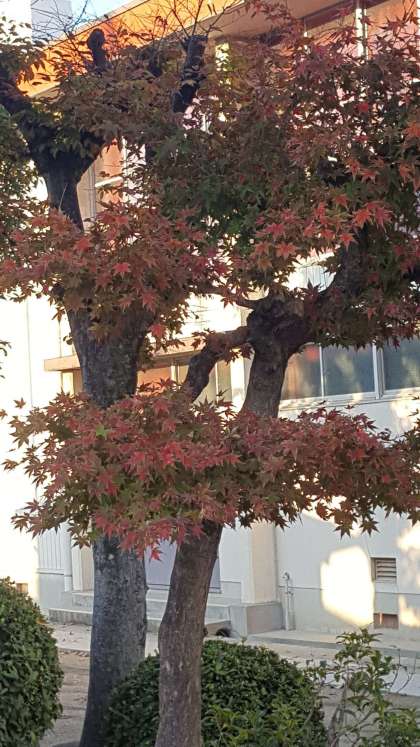 もみじがようやく色づきました。美しいです。もう1枚は、最後の一葉です。いつまで気にとどまっているでしょうか。