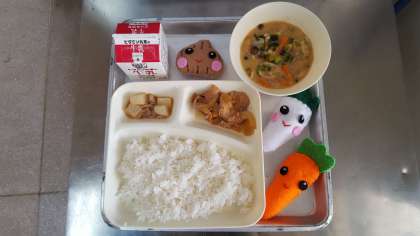 今日の献立は、鶏肉の甘辛焼き・みそ汁・大根の煮物・ごはん・牛乳です。