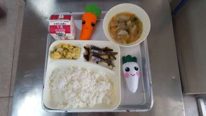 今日の献立は、イワシの生姜煮・うすくず汁・高野豆腐の卵とじ・ごはん・牛乳です。