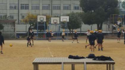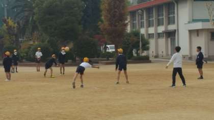 風のない日差しの柔らかい休み時間。子ども達は、思い思いに運動場で体を動かしています。5年生も元気にボール運動をしています。