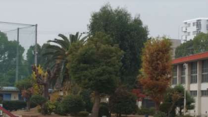 季節が移ろいでいく築山のようすです。給食室横の山茶花が、今一番美しいです。